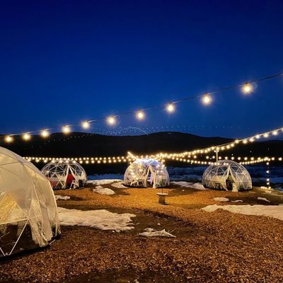 Craft brewery offering a selection of beers and light snack options. The establishment features both indoor and outdoor seating, including unique options like bubble domes and a yurt, providing scenic views.