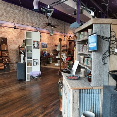Unique art gallery showcasing a diverse collection of handcrafted items. It features pottery, jewelry, leather work, and fiber art from various artists.