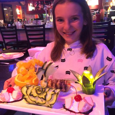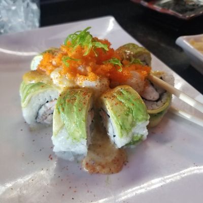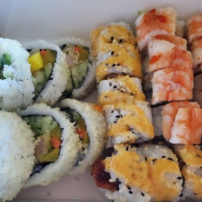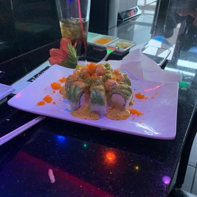 Conveyor belt sushi restaurant with a hibachi grill, offering generous portions and a fun atmosphere.