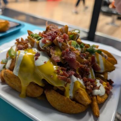 Galaxy Bowl offers a lively atmosphere for bowling and enjoying food and drinks. It features an on-site bar serving cocktails and a menu with burgers, wings, and appetizer platters. long_description