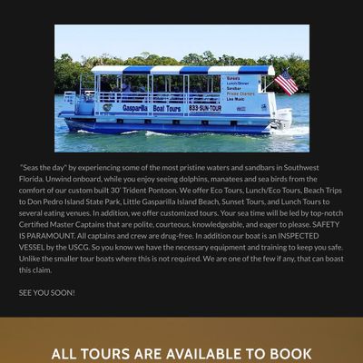 Gasparilla Boat Tours offers scenic excursions focused on wildlife viewing, sunset cruises, and trips to local sandbars. The tours provide opportunities to see dolphins, manatees, and diverse bird species in their natural habitat.
