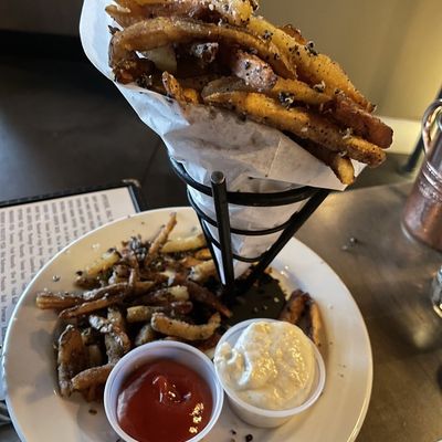 American bar restaurant with a beautiful patio, offering varied cuisine including American, seafood, and upscale dishes, sometimes with slow service.
