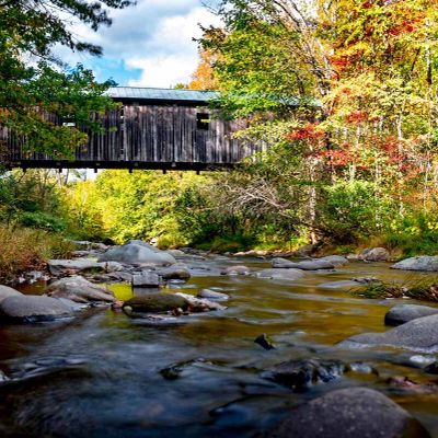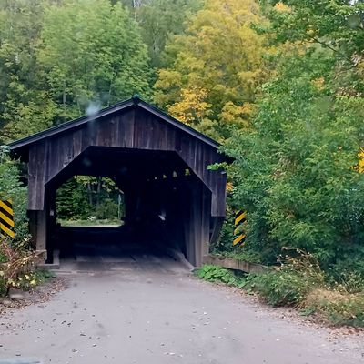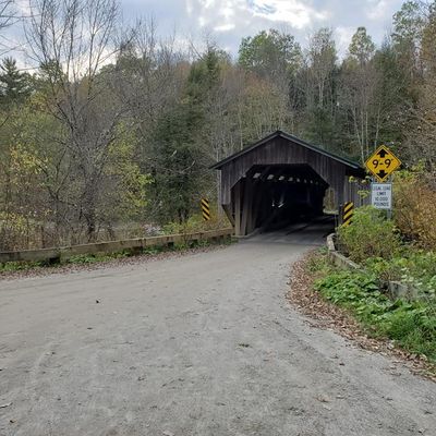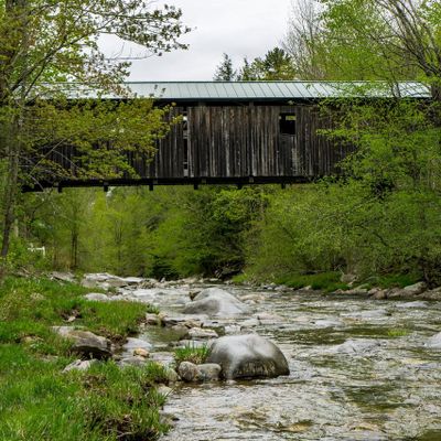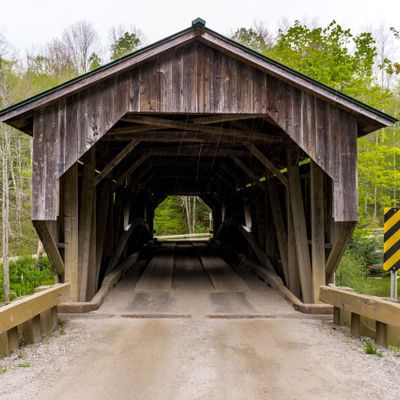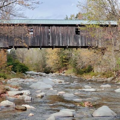 Historic Burr Arch truss bridge, originally built in 1872. It spans the Brewster River and is noted for its well-maintained structure and picturesque setting.