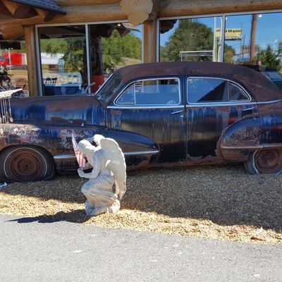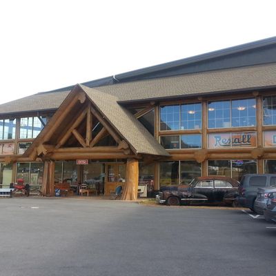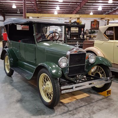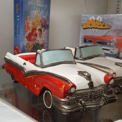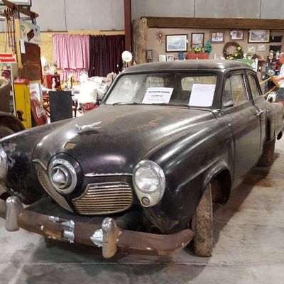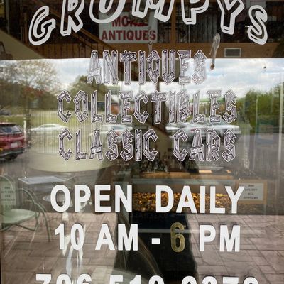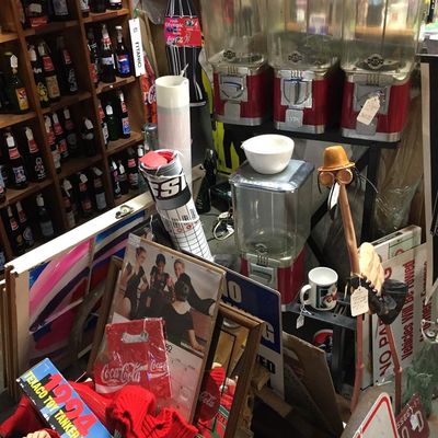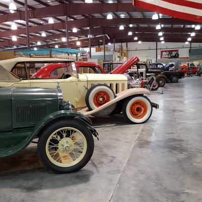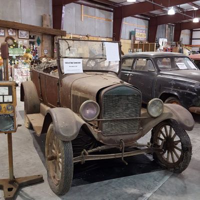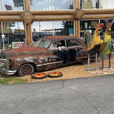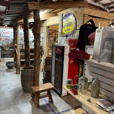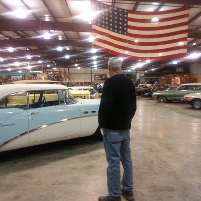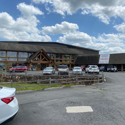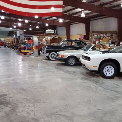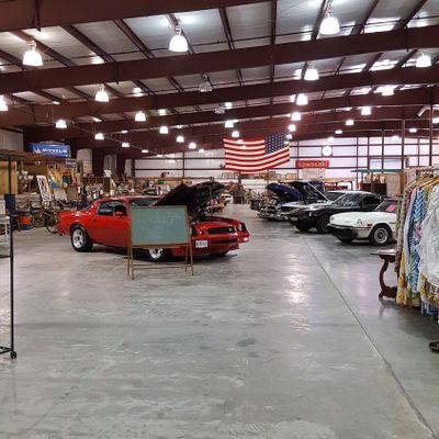 Vast antique mall spread across three floors, offering a wide array of vintage items and collectibles. The venue features numerous vendor booths with diverse merchandise, including signage, glassware, toys, and a notable collection of classic cars.