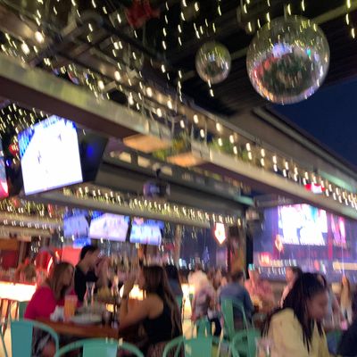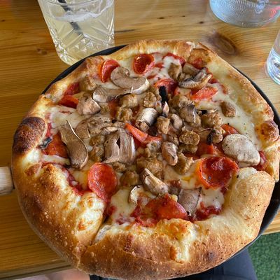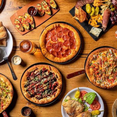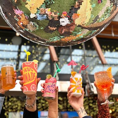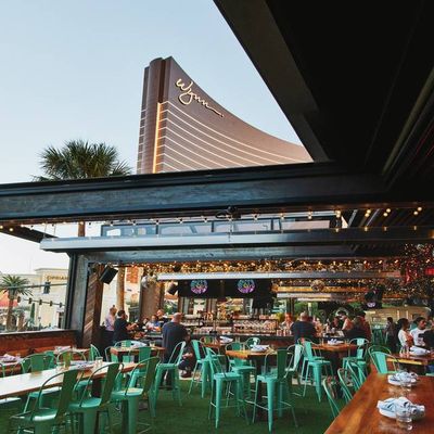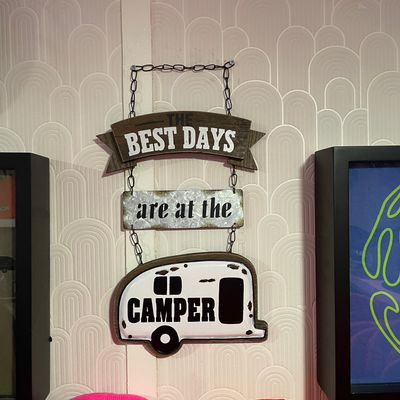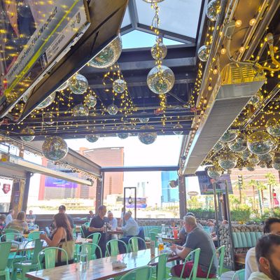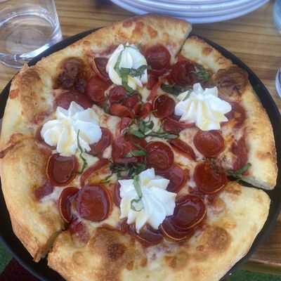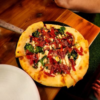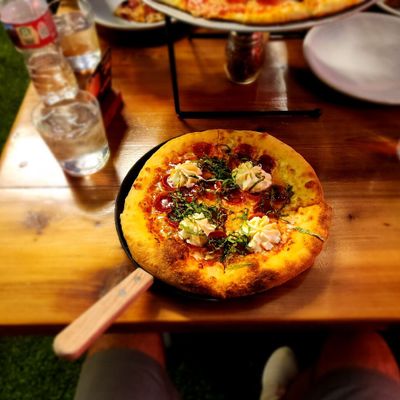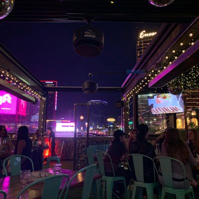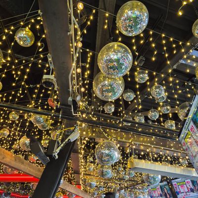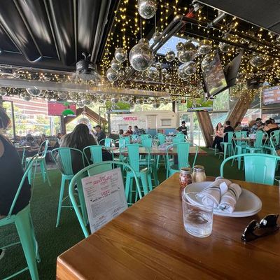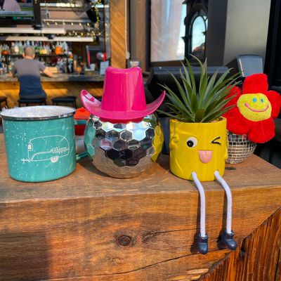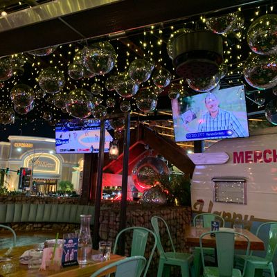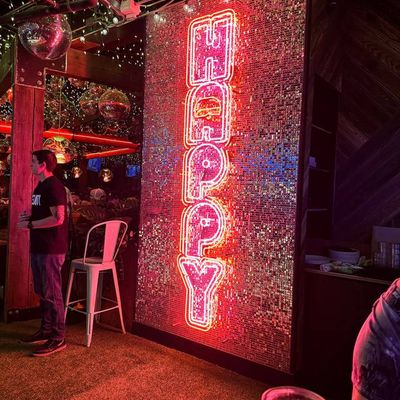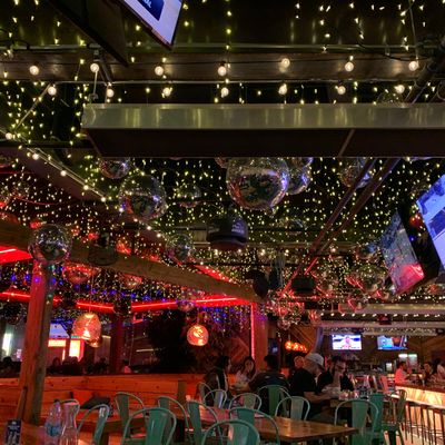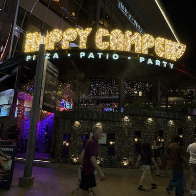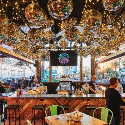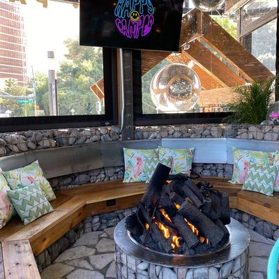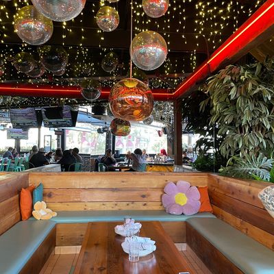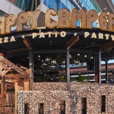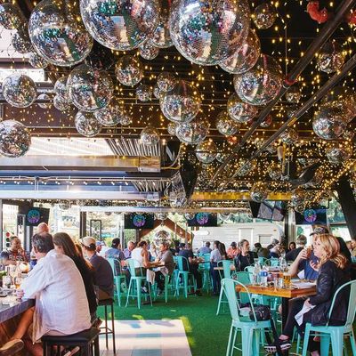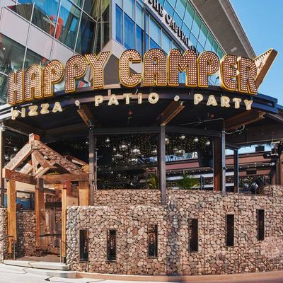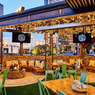 Dine outside on a patio decked with disco balls, neon lights, and a vintage camper, gathered around fire pits for share platters and breakfast pizzas.