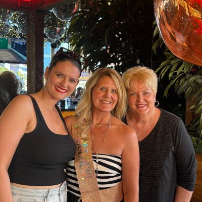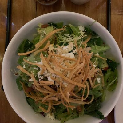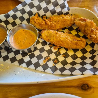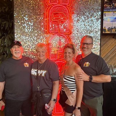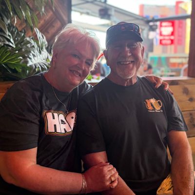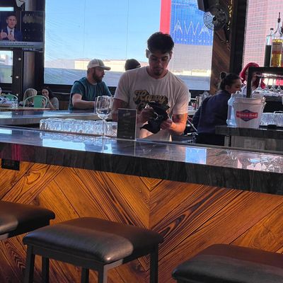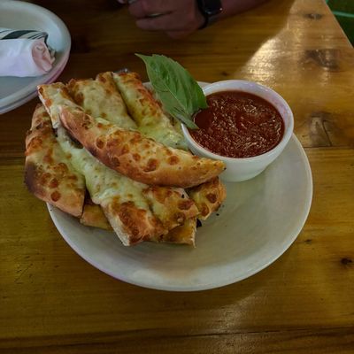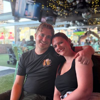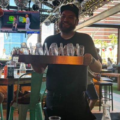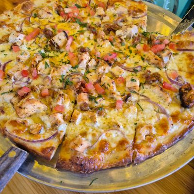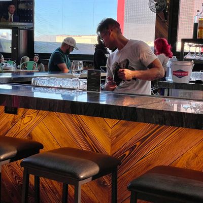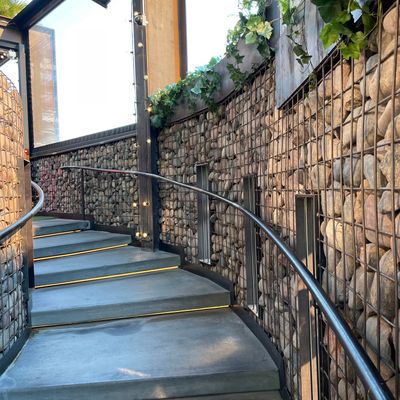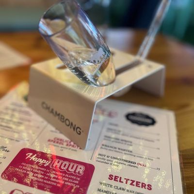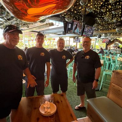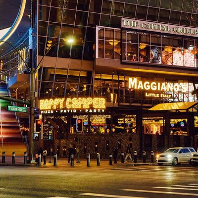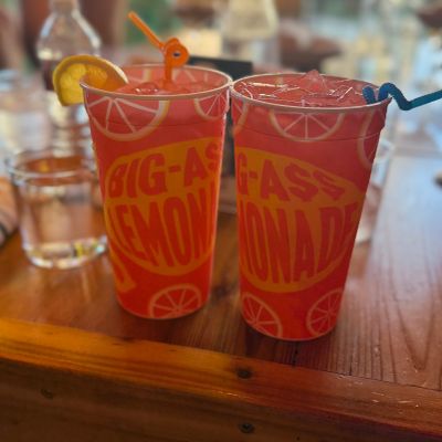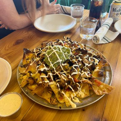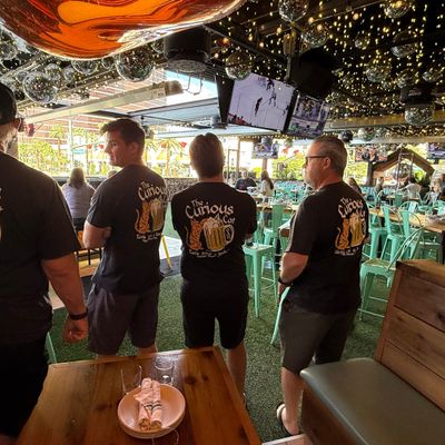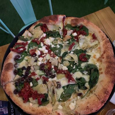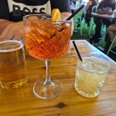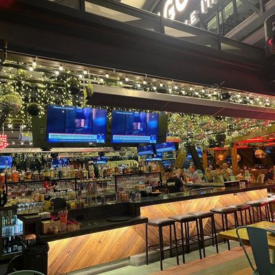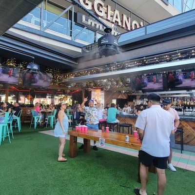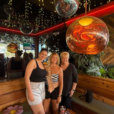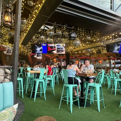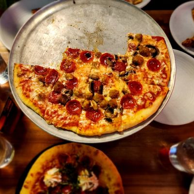 Dine outside on a patio decked with disco balls, neon lights, and a vintage camper, gathered around fire pits for share platters and breakfast pizzas.
