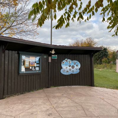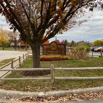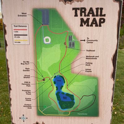 Versatile community space suitable for all ages. It features a dedicated children's play area with diverse equipment, a scenic walking trail offering views of a pond and rolling hills, and multiple sports fields.