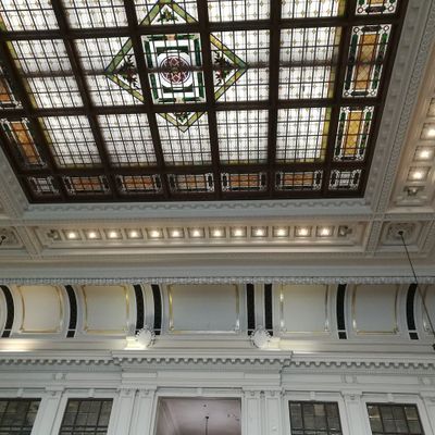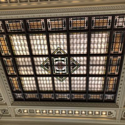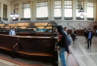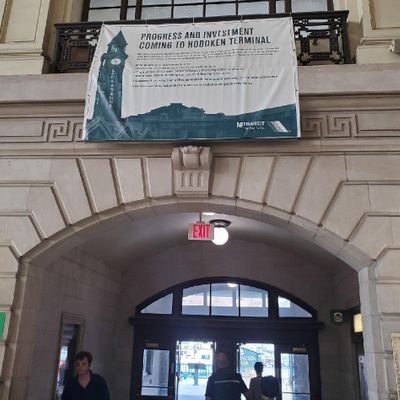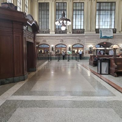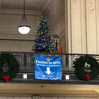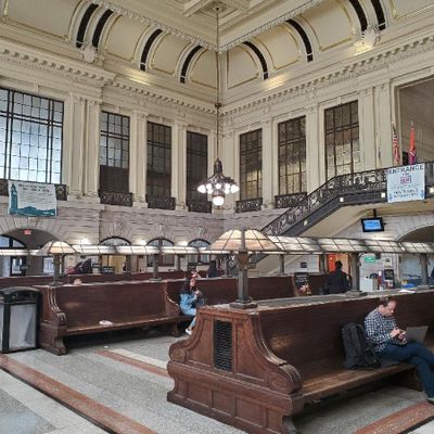 Historic transit hub offering ferry and train services to New York City and points west. The building features august, classic architecture with ornate ironwork, stained glass windows, and a sweeping marble staircase.