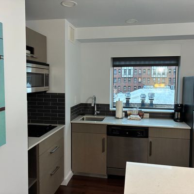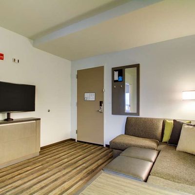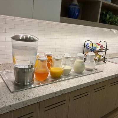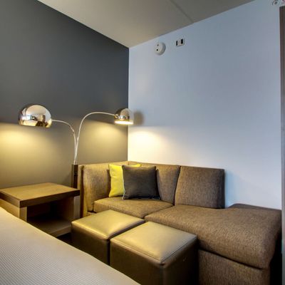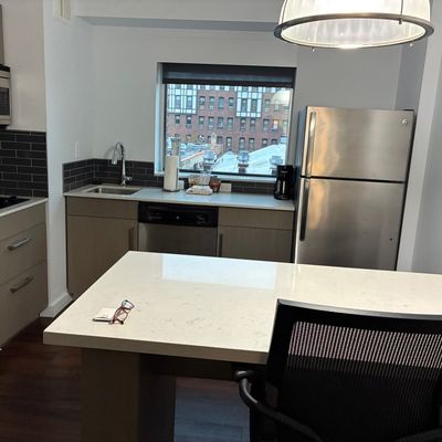 The atmosphere is functional and modern, centered around a lobby area that serves as a convenient hub for quick drinks or a casual meeting. The space feels designed for extended stays, offering a sense of home-like comfort through its apartment-style layout.ambiance_potoo