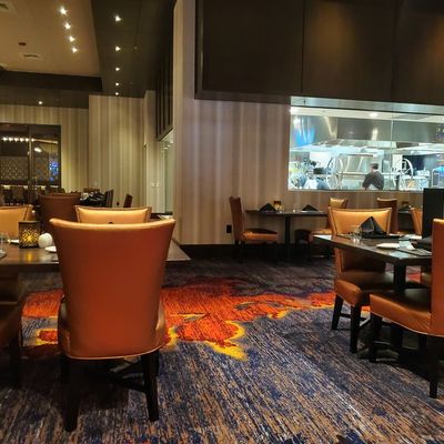 Upscale, 21+ steakhouse in a casino setting, offering charcoal-grilled steaks, creative cocktails, and other items like pasta and seafood.