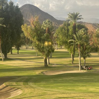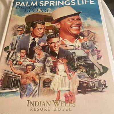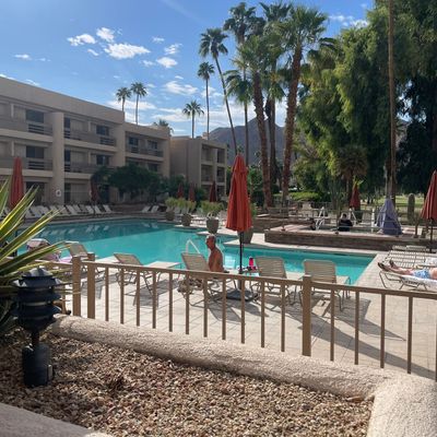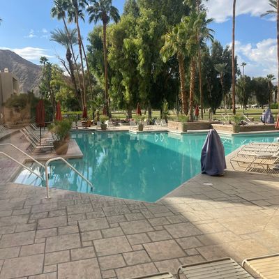 Historic desert property that once hosted Hollywood legends. It features a sparkling pool, a golf course, and an inviting bar and dining area.