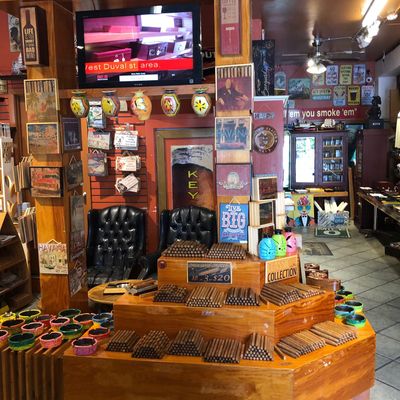 Shop offering a variety of cigars, some of which are hand-rolled on-site. The establishment features a lounge area where patrons can enjoy their purchases, and also offers beer and sodas.