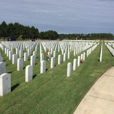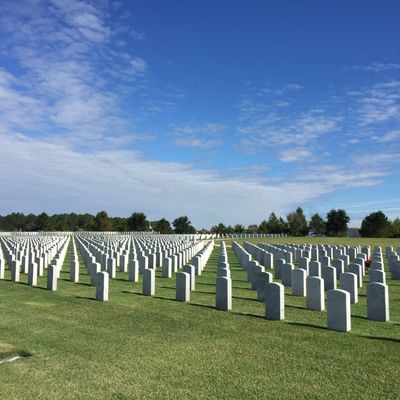 Meticulously maintained national burial ground honoring the service of veterans. The grounds are characterized by uniform headstones arranged in orderly rows, creating a solemn and peaceful atmosphere.