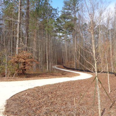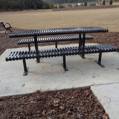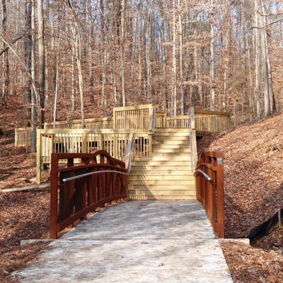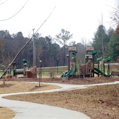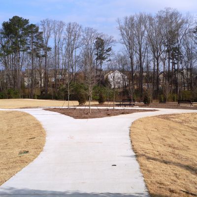 Well-maintained community space featuring playgrounds for various age groups, including adapted swings. It offers paved walking paths that wind through wooded areas and cross a scenic bridge over a stream.