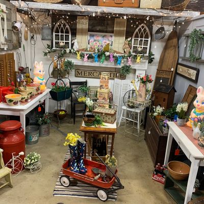 Spacious store offering a wide variety of home decor items, from modern farmhouse styles to antique pieces. The store features a diverse selection of goods, including furniture, clothing, and specialty food items like cheeses and candies.