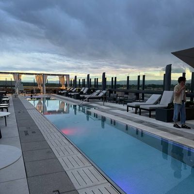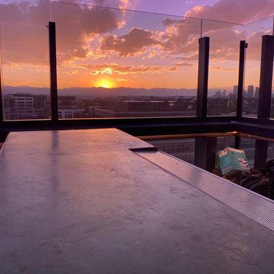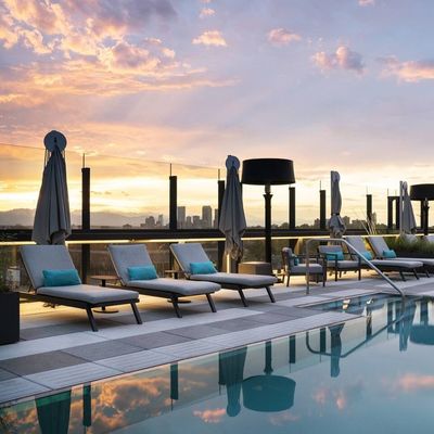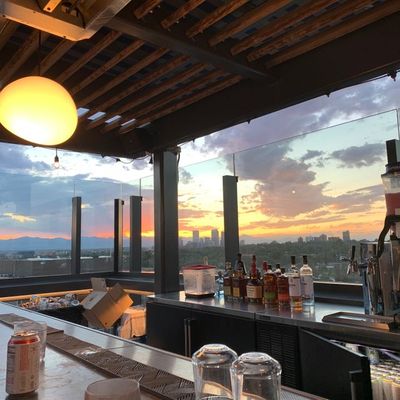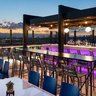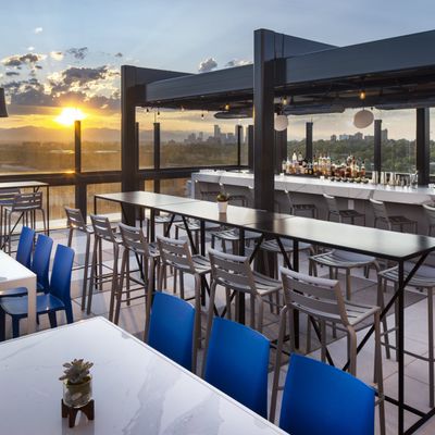Luxury rooftop bar and restaurant with craft cocktails, gourmet food, and a vibrant atmosphere featuring DJs and yoga.