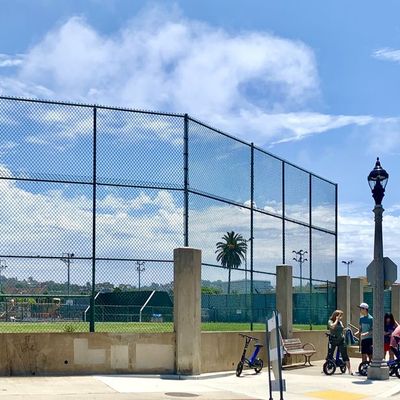 Historic public facility designed by Irving Gill, offering a variety of amenities for all ages. It features playgrounds for different age groups, basketball courts, tennis backboards, and grassy areas for general recreation.