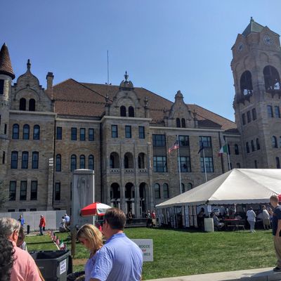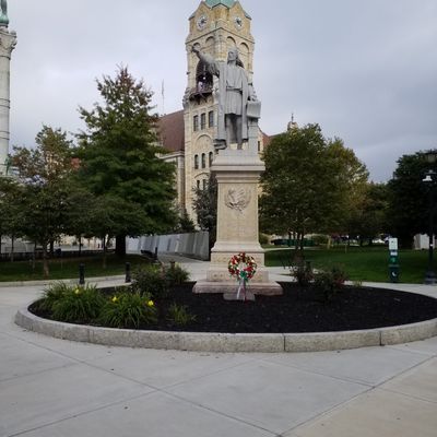 Grand public space featuring impressive Romanesque Revival architecture. The square is a well-maintained park-like setting adorned with various monuments, historical markers, and seasonal decorations, honoring veterans and notable figures.