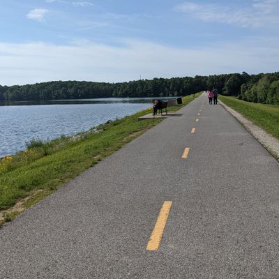 Scenic destination offering a variety of outdoor activities. Visitors can enjoy paved walking and biking trails that loop around the water, with options for more challenging mountain biking.