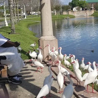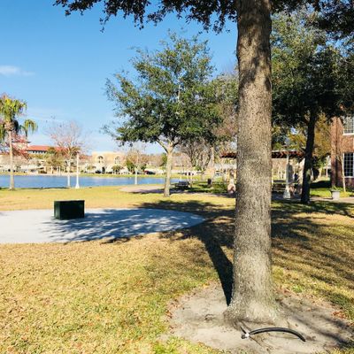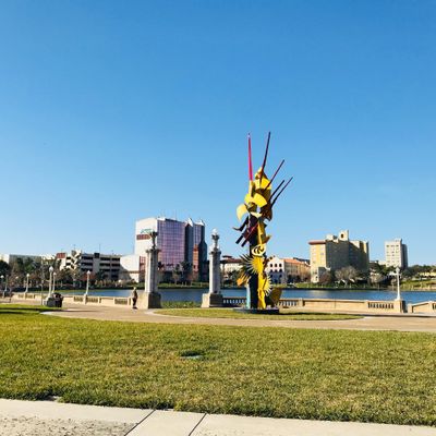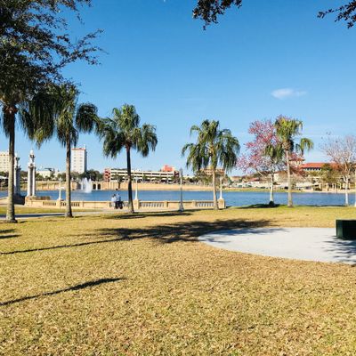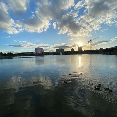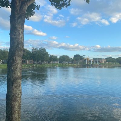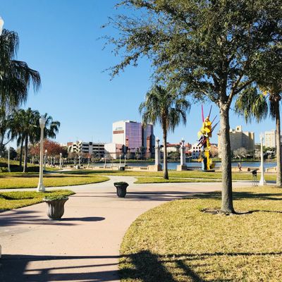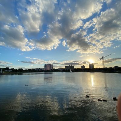 Scenic urban park featuring a lake surrounded by wide paved pathways, ideal for walking, biking, and leisurely strolls. The area boasts beautiful gardens, public art installations, and ample space to observe local wildlife.