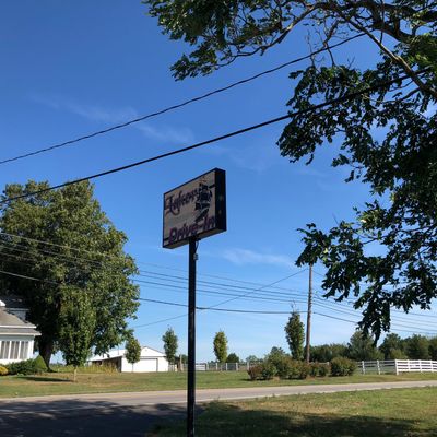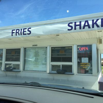 Classic drive-in restaurant with burgers, shakes, and other diner fare, featuring a walk-up window and outdoor seating.
