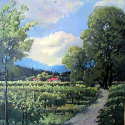 Fine art gallery showcasing a diverse collection of works. The gallery features primarily traditional art, including oil paintings, watercolors, pastels, sculptures, and fine wood turning, with a focus on local landscapes and vineyard scenes. long_description