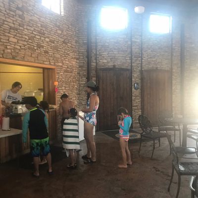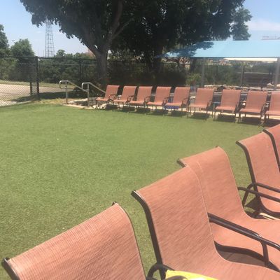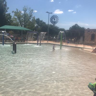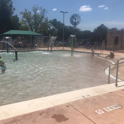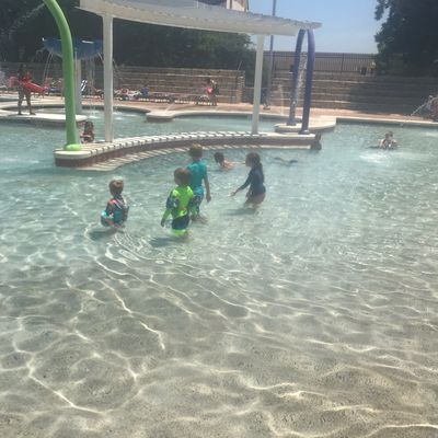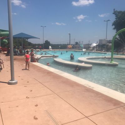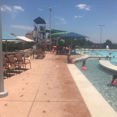 Family-friendly aquatic facility featuring a zero-depth entry, multiple water features, and two large water slides. The pool offers various seating options, including tiered bleachers and lawn chairs, though shaded areas are limited. long_description