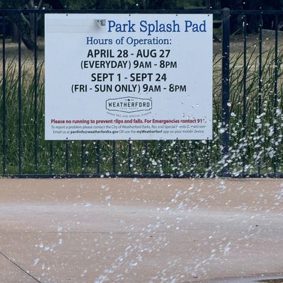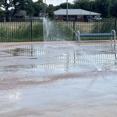 Family-friendly outdoor space featuring a splash pad, a large pond, and a playground. It offers a refreshing escape from the heat with its water features and ample space for recreation.