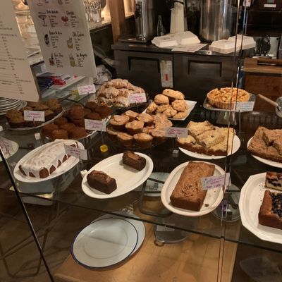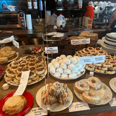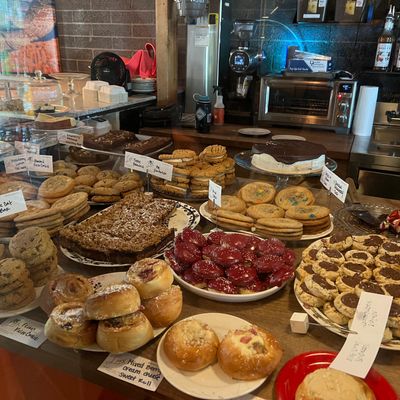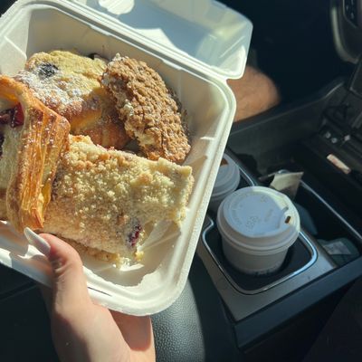 Enjoy a variety of coffee-based drinks alongside an assortment of baked goods, including several vegan-friendly options. The selection includes both standard coffee and non-dairy milk alternatives.food_potoo