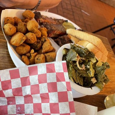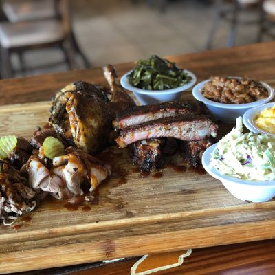 Local, spacious barbecue restaurant offering generous portions of flavorful smoked meats, sides, and even prime rib; some dishes receive mixed reviews.