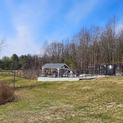 Dedicated outdoor space for dogs and their owners. This fenced-in park features separate areas for small and large dogs, a pavilion for human relaxation, and is surrounded by forest.