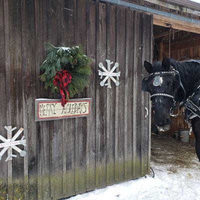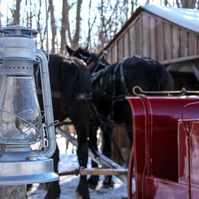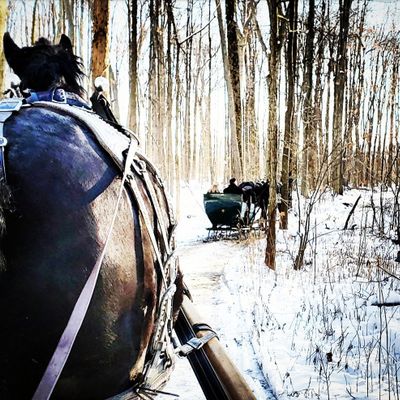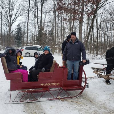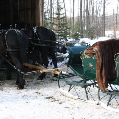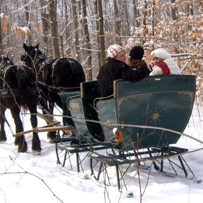 Ma And Pa's Cabin And Sleigh Rides offers horse-drawn sleigh rides through wooded trails, often accompanied by the sounds of sleigh bells. Visitors can enjoy the scenic winter landscape, with blankets provided for warmth.