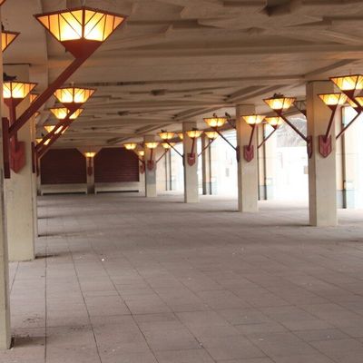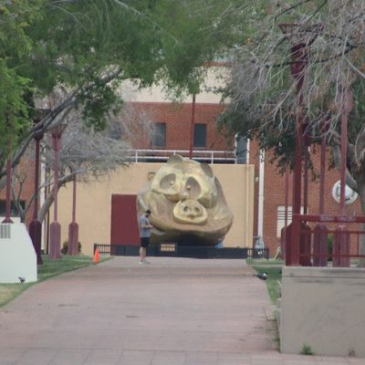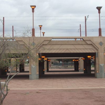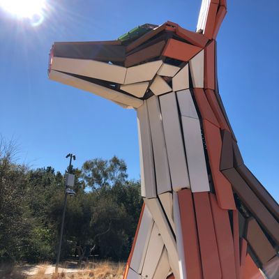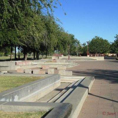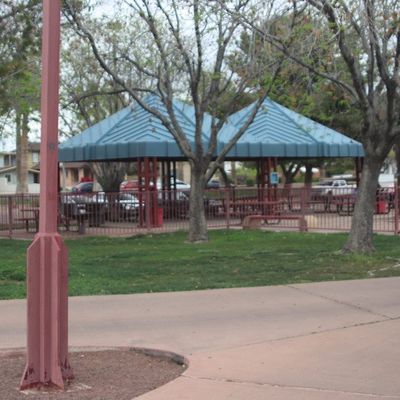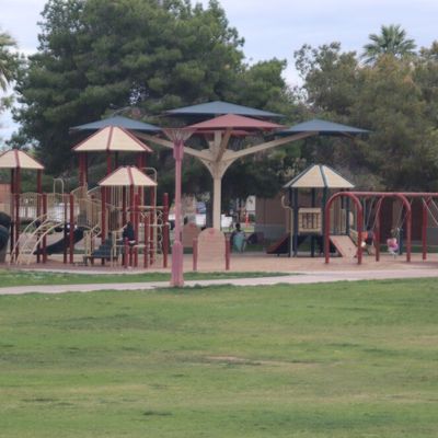 Large urban green space centrally located. It features extensive lawns, walking paths, and a notable playground with large animal climbing structures and water misters.