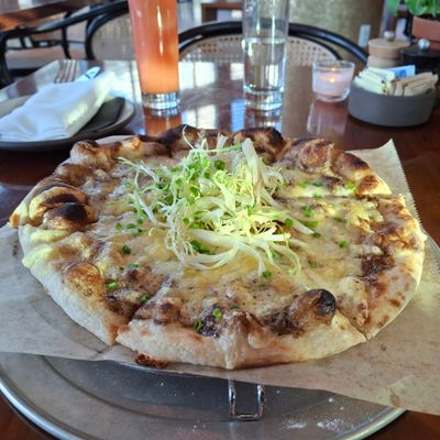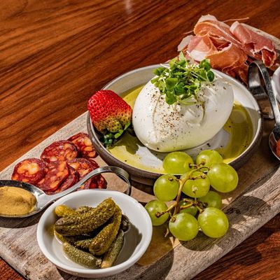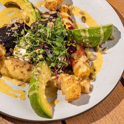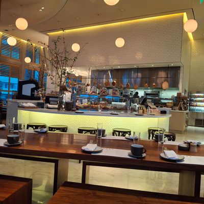 Upscale food hall with diverse breakfast, lunch, and dinner options, including Italian, sushi, and bakery items, offering a chic, modern ambiance with both indoor and outdoor seating.