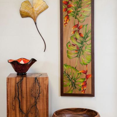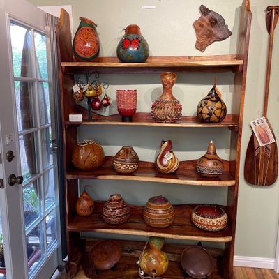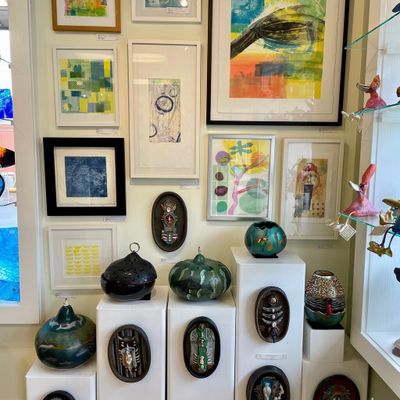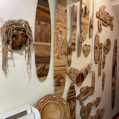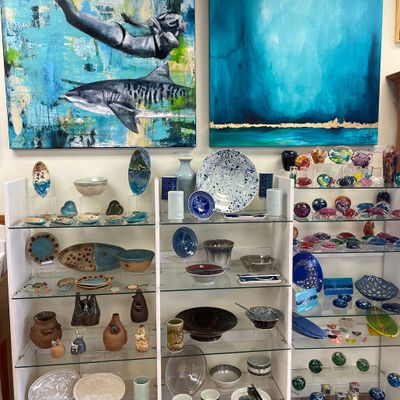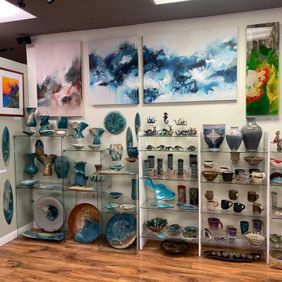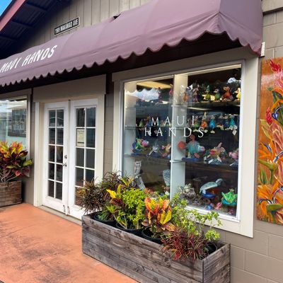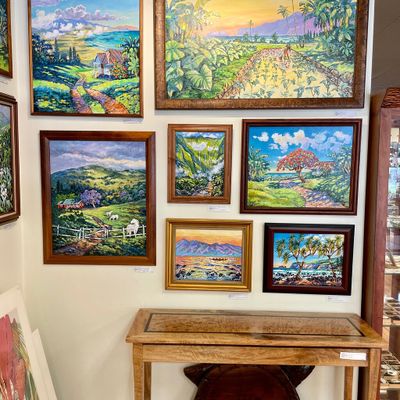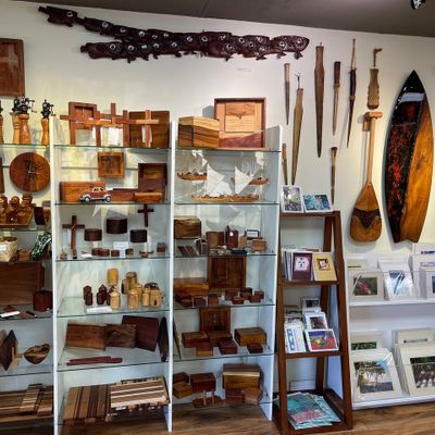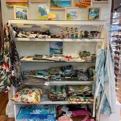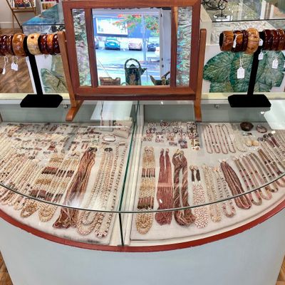 Gallery featuring a diverse collection of high-quality, locally made art and crafts. The shop offers a wide range of items, including unique Ni'ihau shell leis, woodcrafts, glass art, and jewelry, with pieces available at various price points. long_description