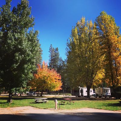 Well-maintained RV park featuring grassy areas, mature trees, and a small creek. It offers various accommodations including RV sites, cabins, and teepees.