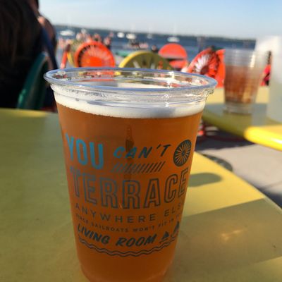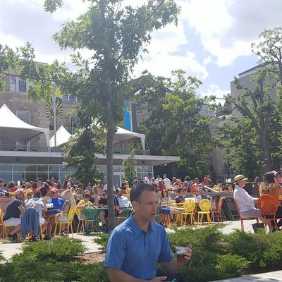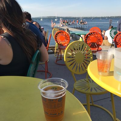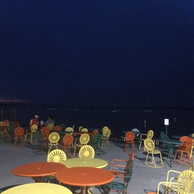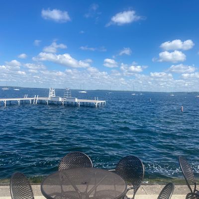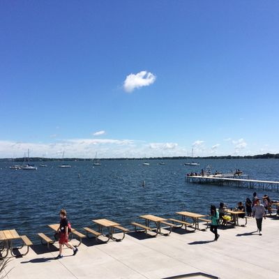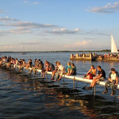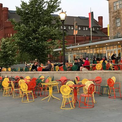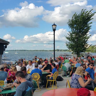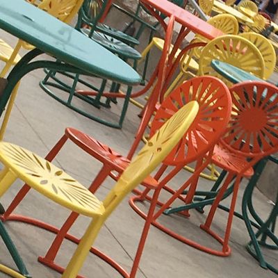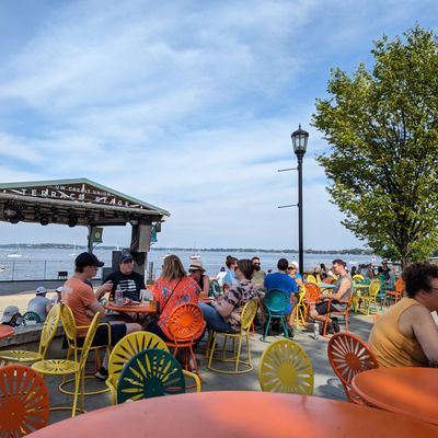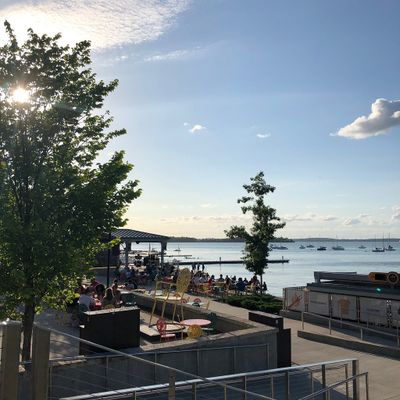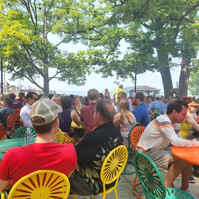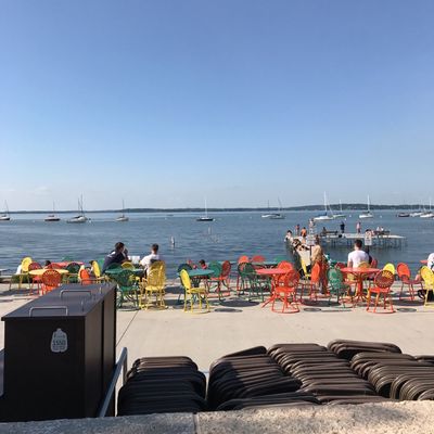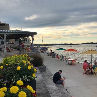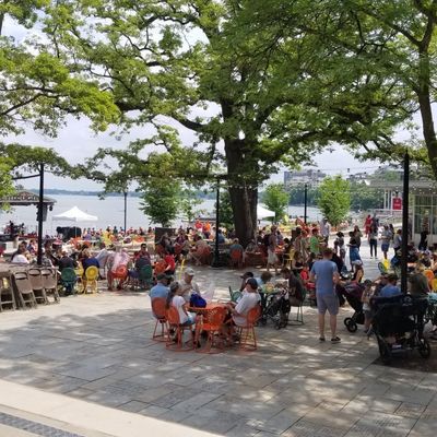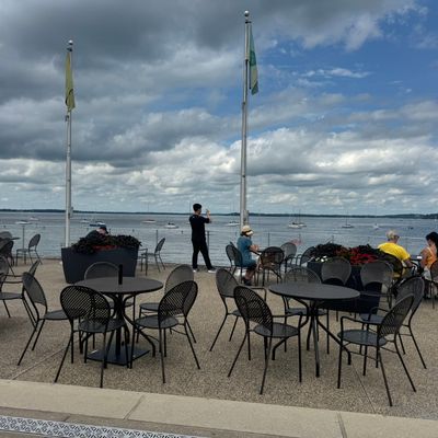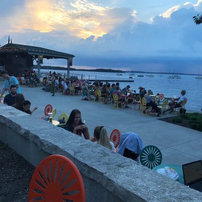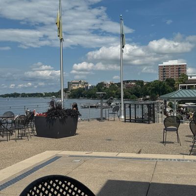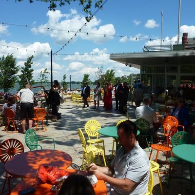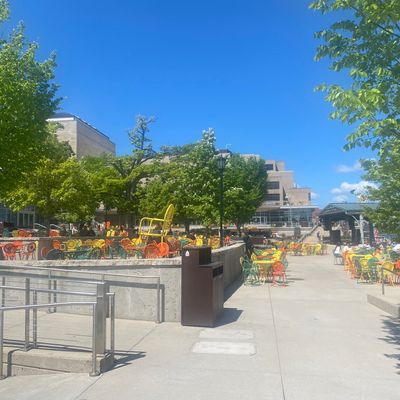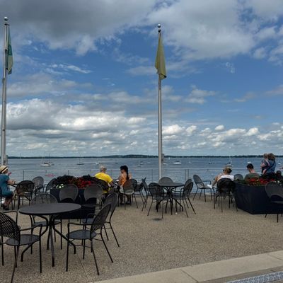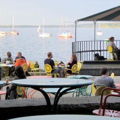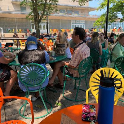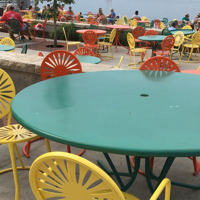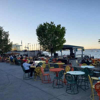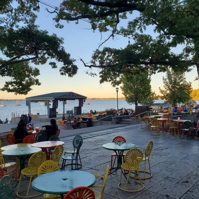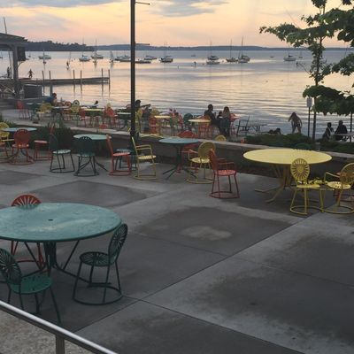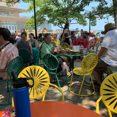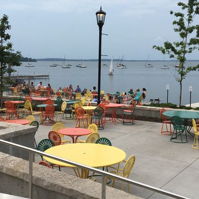 Iconic outdoor gathering space offering stunning lake views and a lively atmosphere. It features abundant seating, including the famous sunflower chairs, alongside diverse food and drink options.