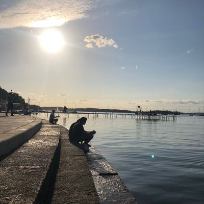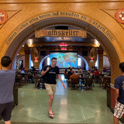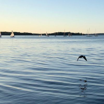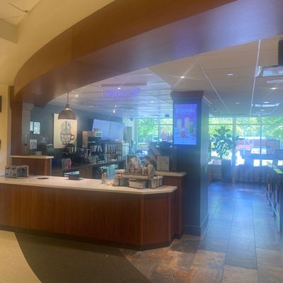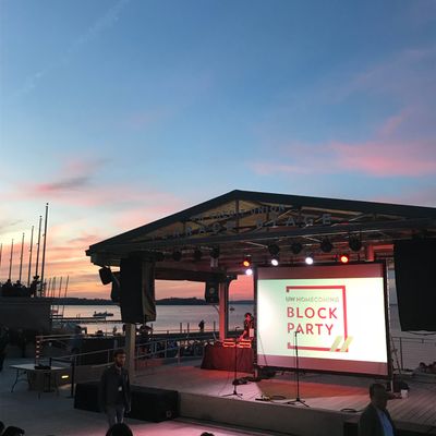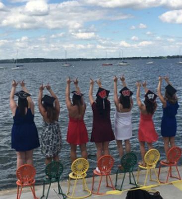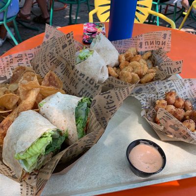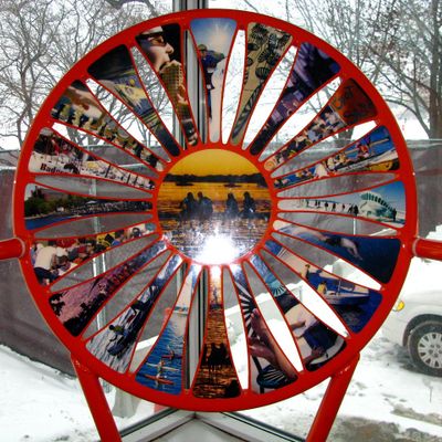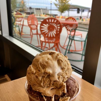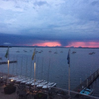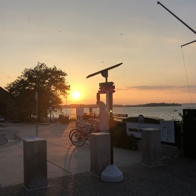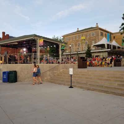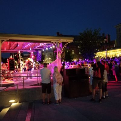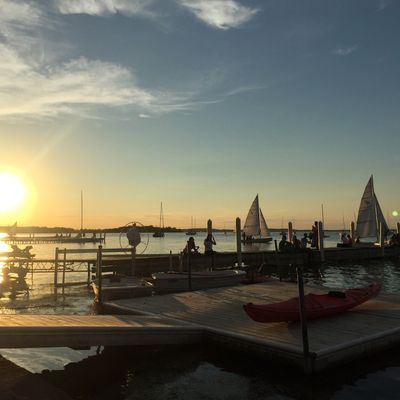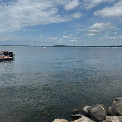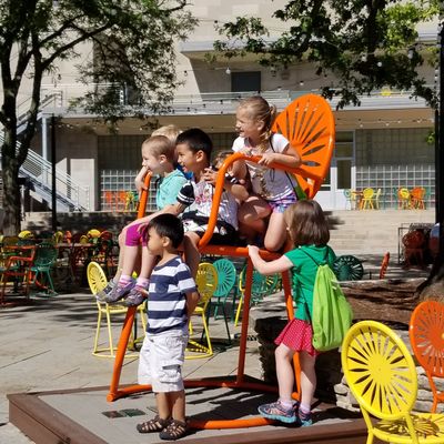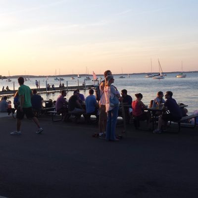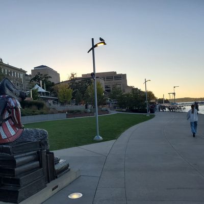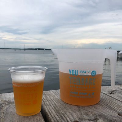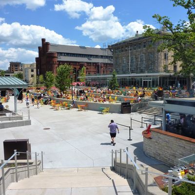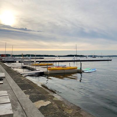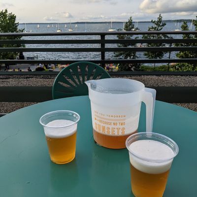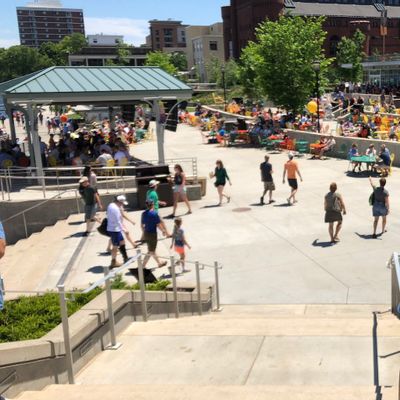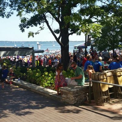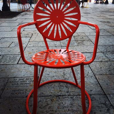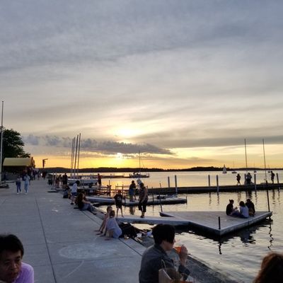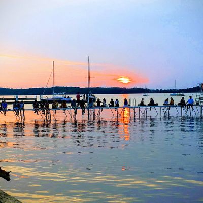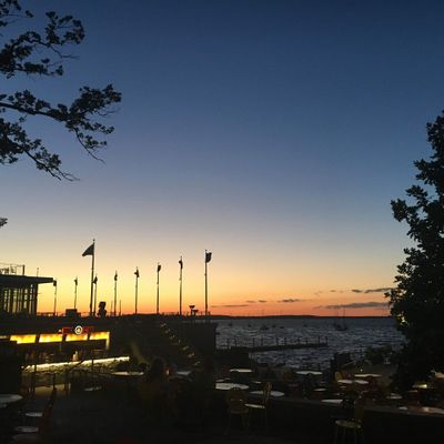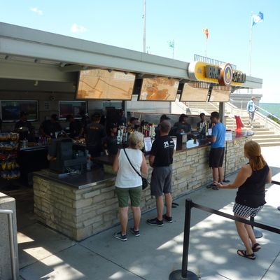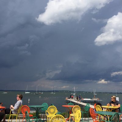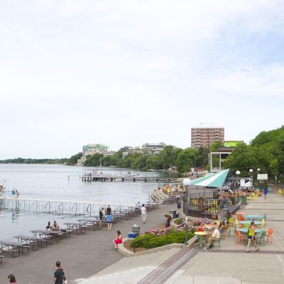 Iconic outdoor gathering space offering stunning lake views and a lively atmosphere. It features abundant seating, including the famous sunflower chairs, alongside diverse food and drink options.
