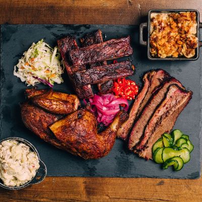 Casual chain barbecue restaurant offering slow-smoked meats and sides, with a Chipotle-style ordering system and convenient takeout options.