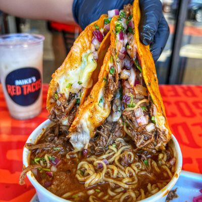 Indulge in the signature beef birria tacos served with a side of savory consommé for dipping. For something different, try the birria ramen or the Crunchstack, which features queso, guacamole, and beef birria.food_potoo