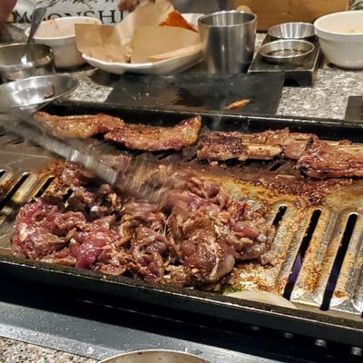 Diners go for thinly sliced prime brisket, prime pork belly, pork collar butt, rib-eye steak, and more options, all served with Korean side dishes, salad, steamed egg, corn cheese, and stew.