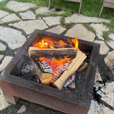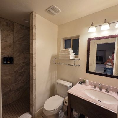 Mountain Ridge Cabins and Lodging offers modern, well-appointed cabins with a cozy exterior and comfortable, clean interiors. Guests can enjoy amenities like plush towels, modern bathrooms, and a communal fire pit with s'mores.