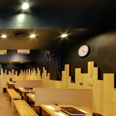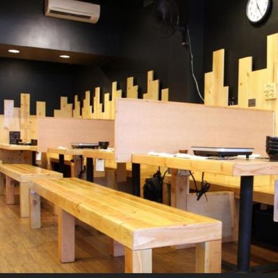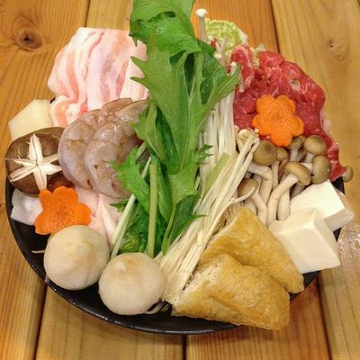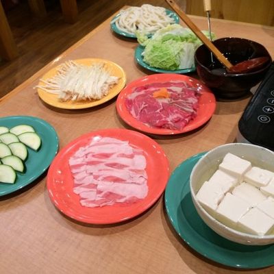 Japanese hot pot restaurant with a warm atmosphere offering delicious broths and a unique self-serve ingredient selection from a cooler.