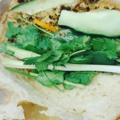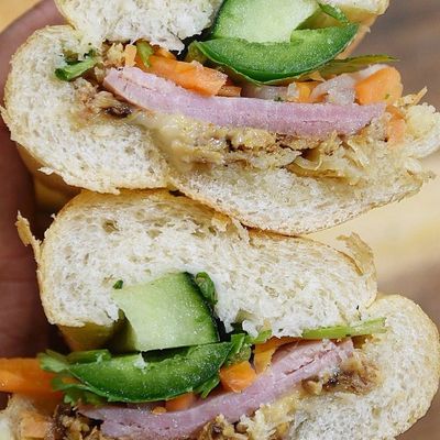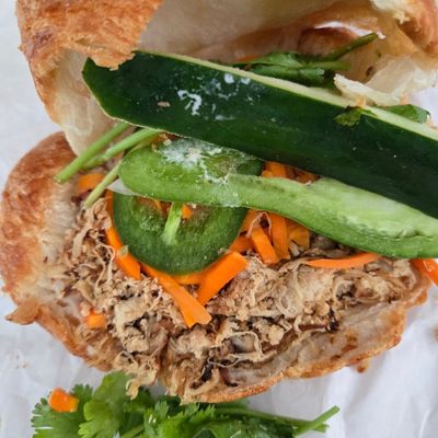 The menu features a variety of Vietnamese-inspired sandwiches, including the savory croissant BBQ chicken and traditional grilled pork Banh Mi. The sandwiches are crafted to provide a flavorful handheld meal.food_potoo