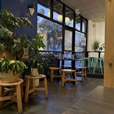 Golden restaurant offering delicious ramen, bao, and other Asian dishes in a setting with sometimes profane music.