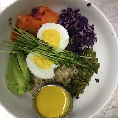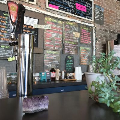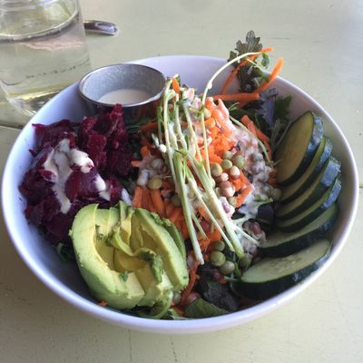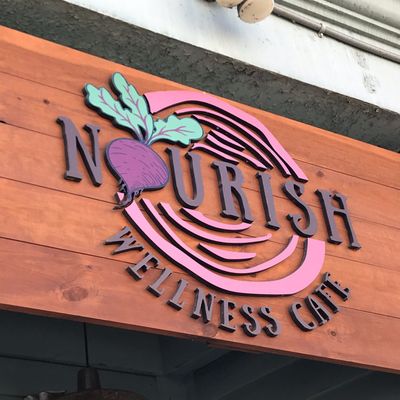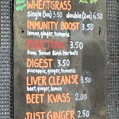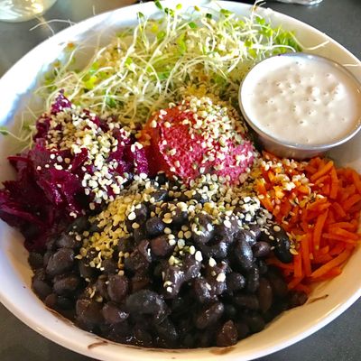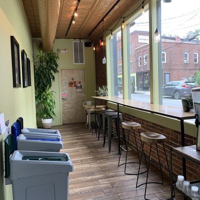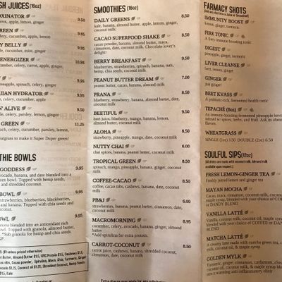 Healthy, plant-based cafe offering bowls, juices, and smoothies with locally-sourced ingredients in a rustic setting.