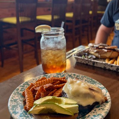 Casual American restaurant and bar in a rustic setting, offering a varied menu including smoked meats, burgers, and salads, with a full bar and upstairs lounge.