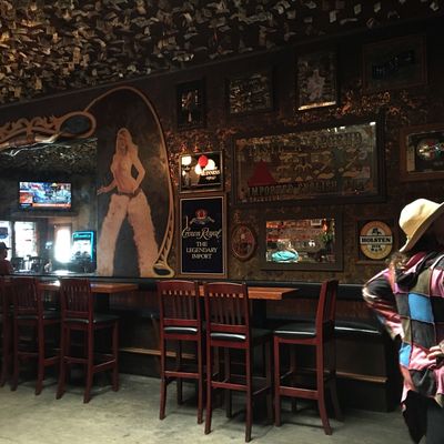 Historic, old-school saloon with a friendly atmosphere and a unique "old west" vibe. The walls and ceiling are famously adorned with signed dollar bills, and the establishment often features live music on weekends.