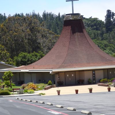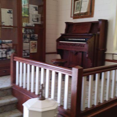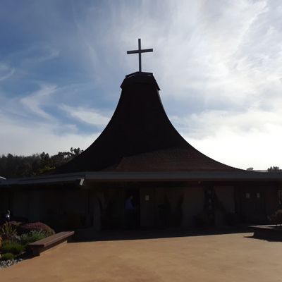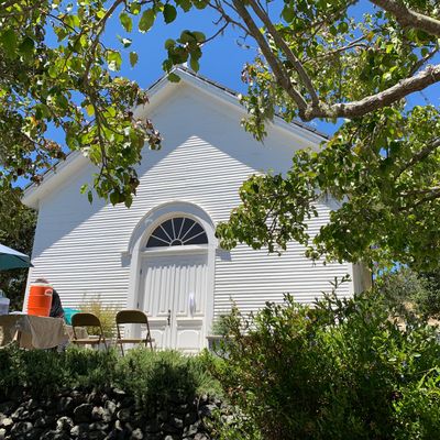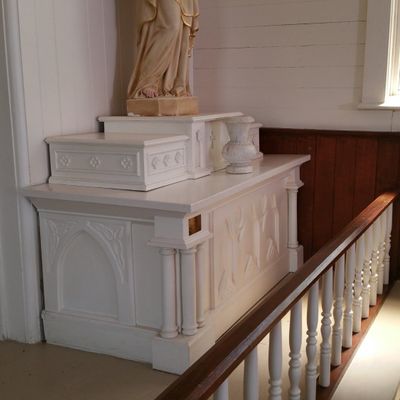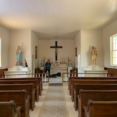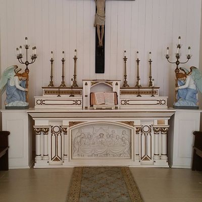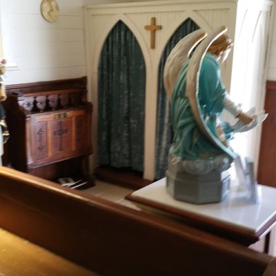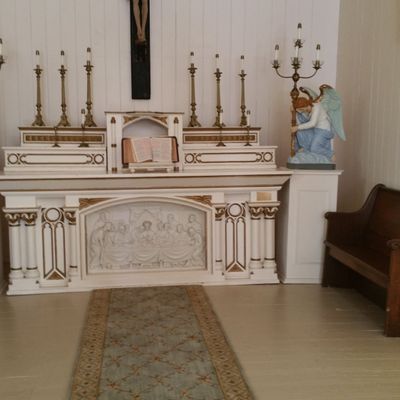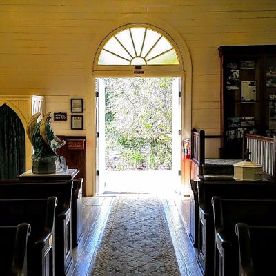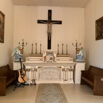 Historic chapel with a quaint adjoining cemetery, offering a glimpse into the past. It is known for its simple elegance, featuring dark wood and pastel blue angels, and its serene setting at the top of a hill.