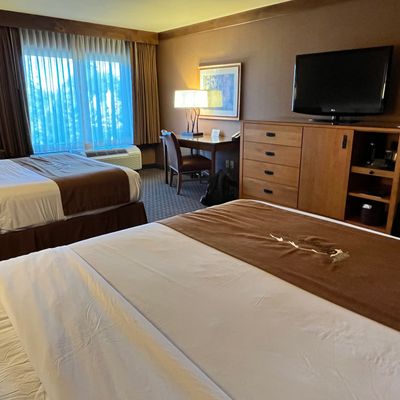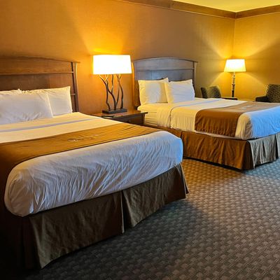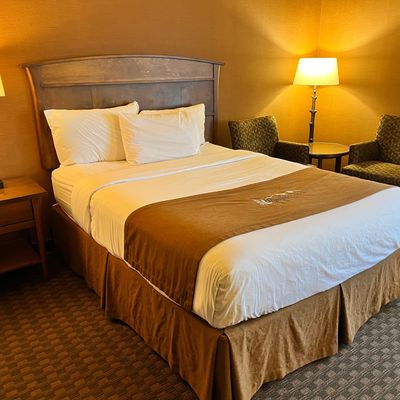 Upscale lodge offering comfortable rooms and beautifully furnished common areas. The property features landscaped grounds with a water feature, overlooking a golf course, providing a tranquil environment.